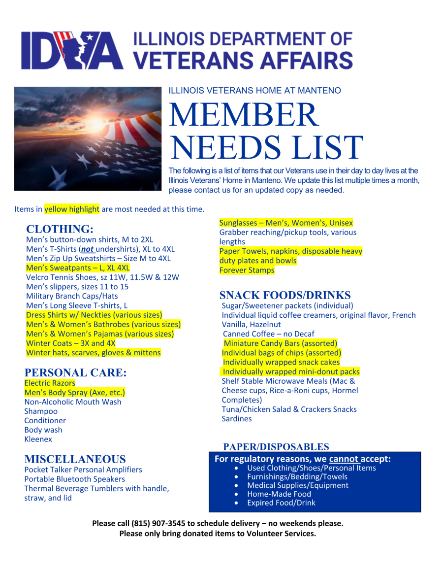 Drive for Manteno Veterans Home, Oct. 11-Nov. 9